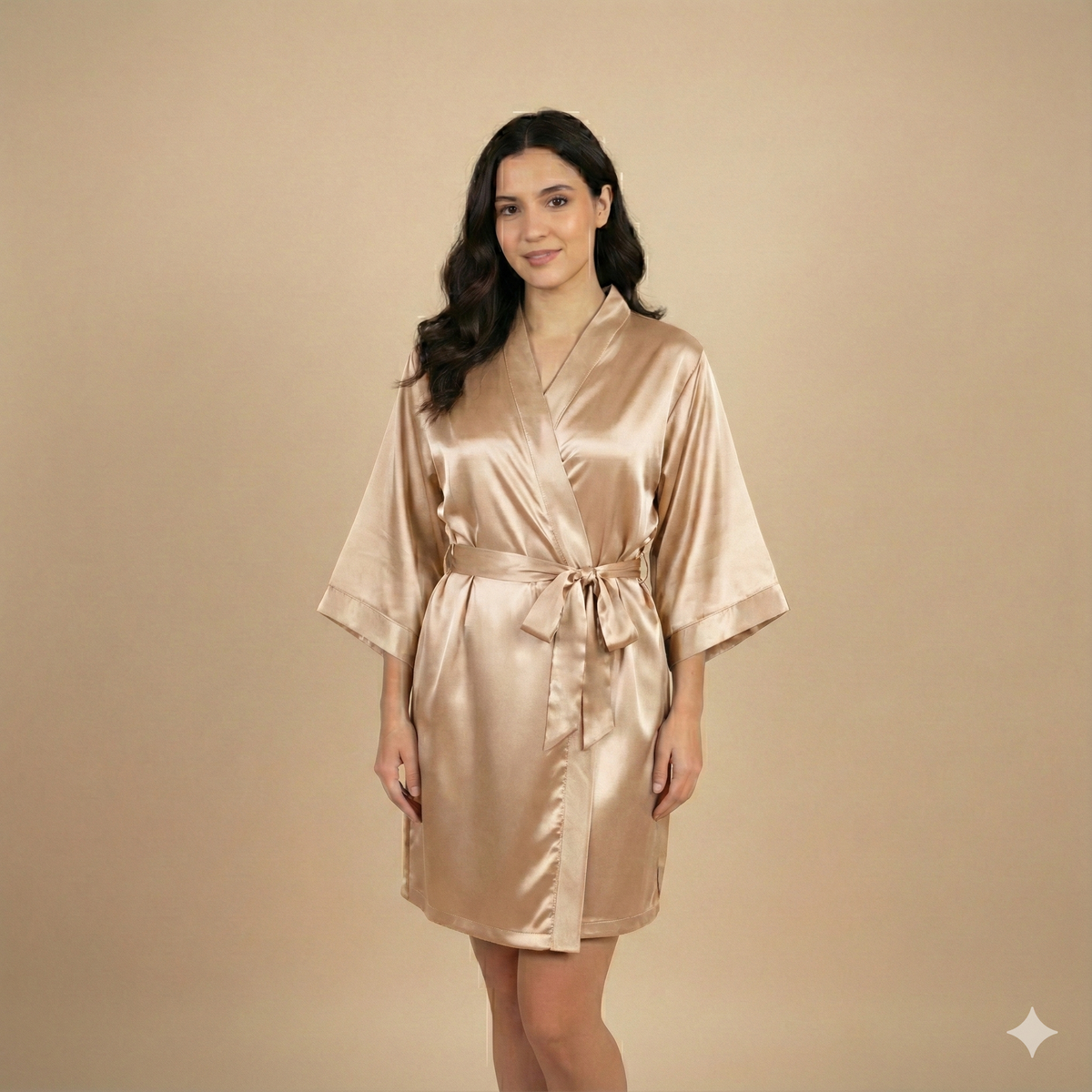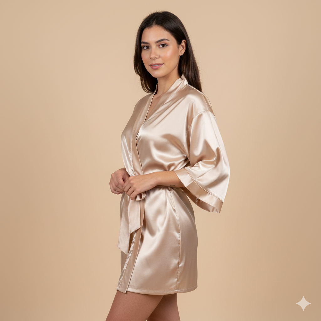 Descubre la combinación perfecta entre sencillez y estilo. Nuestra bata corta de satén está diseñada para quienes buscan comodidad y un tacto suave a la piel. Su confección minimalista y corte tipo qimono la convierten en la prenda básica que no puede faltar en tu colección. Ideal para estar a gusto en casa o para prepararte antes de salir.