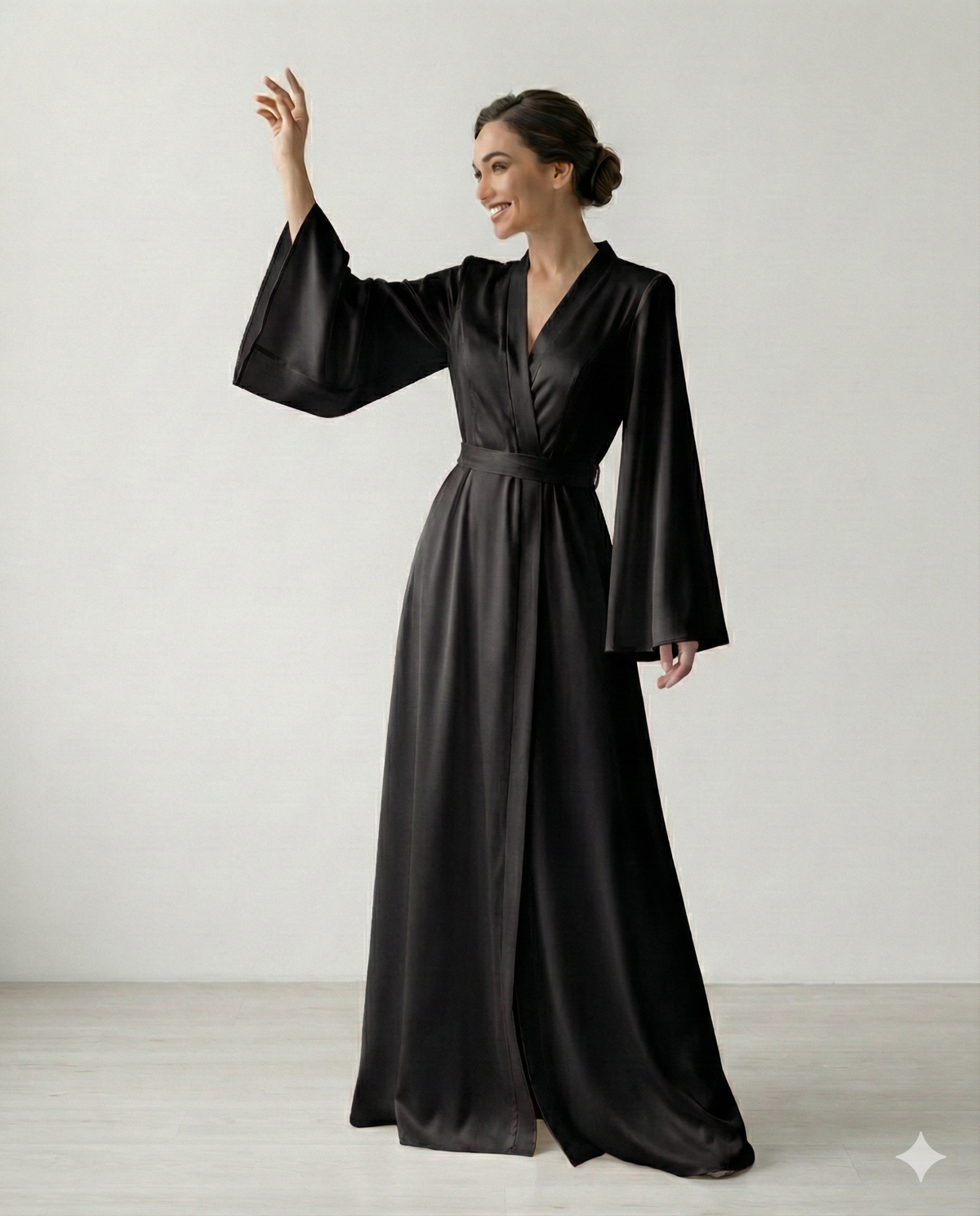 La magia está en los detalles: su diseño con hombros bien definidos te da una postura de reina, mientras que las impresionantes mangas campana XL fluyen con cada uno de tus movimientos, creando un efecto visual hipnótico y súper femenino. La seda acaricia tu piel, y su largo hasta los tobillos te ofrece una cobertura elegante y sensual a la vez.