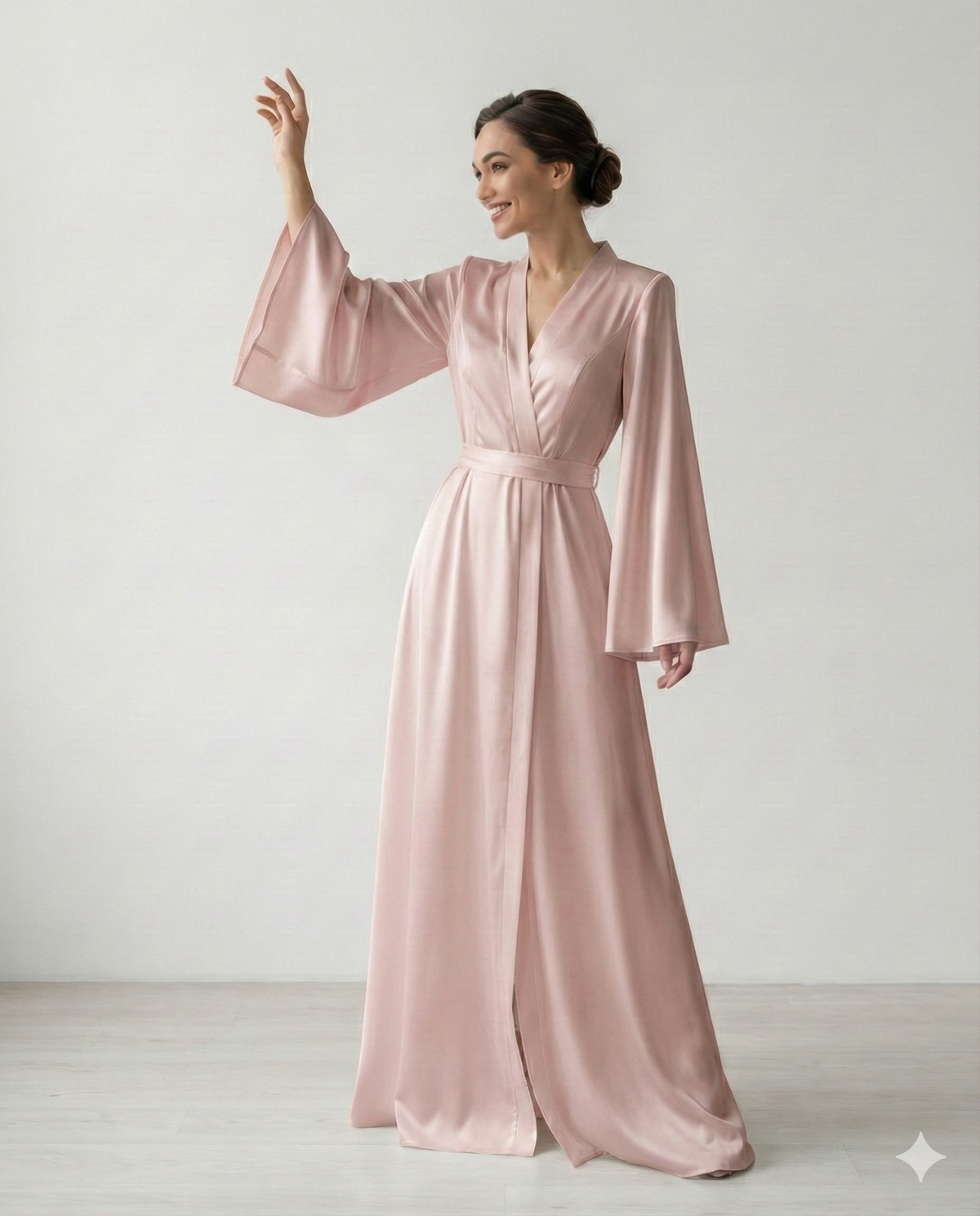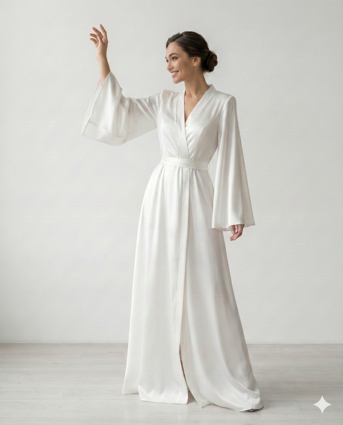 Envuélvete en pura seda y sofisticación. Nuestra nueva bata está diseñada para hacerte sentir especial desde el momento en que te la pones, como decimos siempre: Se empieza a brillar antes de la ceremonia.