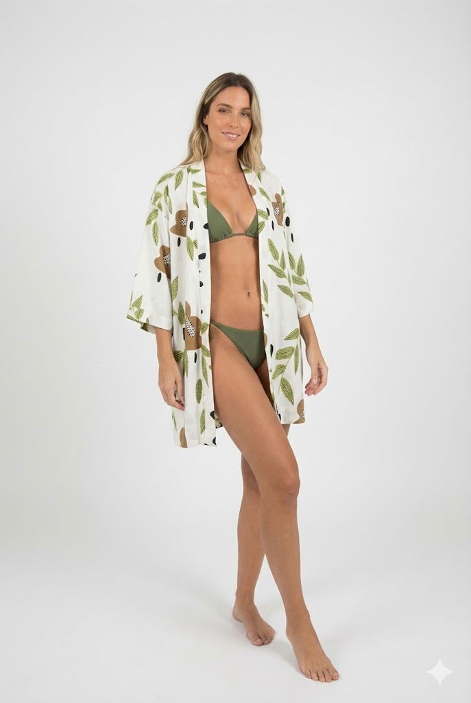 Su diseño es abierto y holgado, sin cinto ni bolsillos, para que sea lo más liviano y fluido posible. El largo es ideal, a la mitad del muslo, perfecto para usar sobre el pijama, bikini, incluso como complemento de cualquier look veraniego. Confeccionado en suave fibrana.